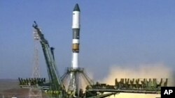 منگل کے روز روس کا ایک راکٹ تین خلابازوں کو لے کر وسطی ایشیا سے بین الاقوامی خلائی اسٹیشن کے لیے اپنے سفر پر روانہ ہوا۔