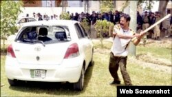 پولیس اہل کاروں کے ہاتھ میں ڈنڈے ہیں اور جیسے ہی گاڑی ان کے نرغے میں آئی انہوں نے گاڑی پر ڈنڈے برسانا شروع کر دیے۔
