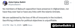 افغانستان میں طالبان حکومت کی وزارتِ خارجہ کے ترجمان عبدالقہار بلخی نے ـ'ایکس' پر جاری کیے گئے بیان میں کہا ہے کہ بلوچ مزاحمت میں شامل کوئی بھی رُکن افغانستان میں نہیں ہے اور نہ ہی کسی کا طالبان حکومت کے ساتھ کوئی تعلق ہے۔
