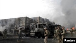 ان کے بقول دھماکوں اور حملہ آوروں کی پولیس کے ساتھ جھڑپ کے دوران نیٹو کو ایندھن فراہم کرنے والے 37 ٹرکوں کو نقصان پہنچا۔