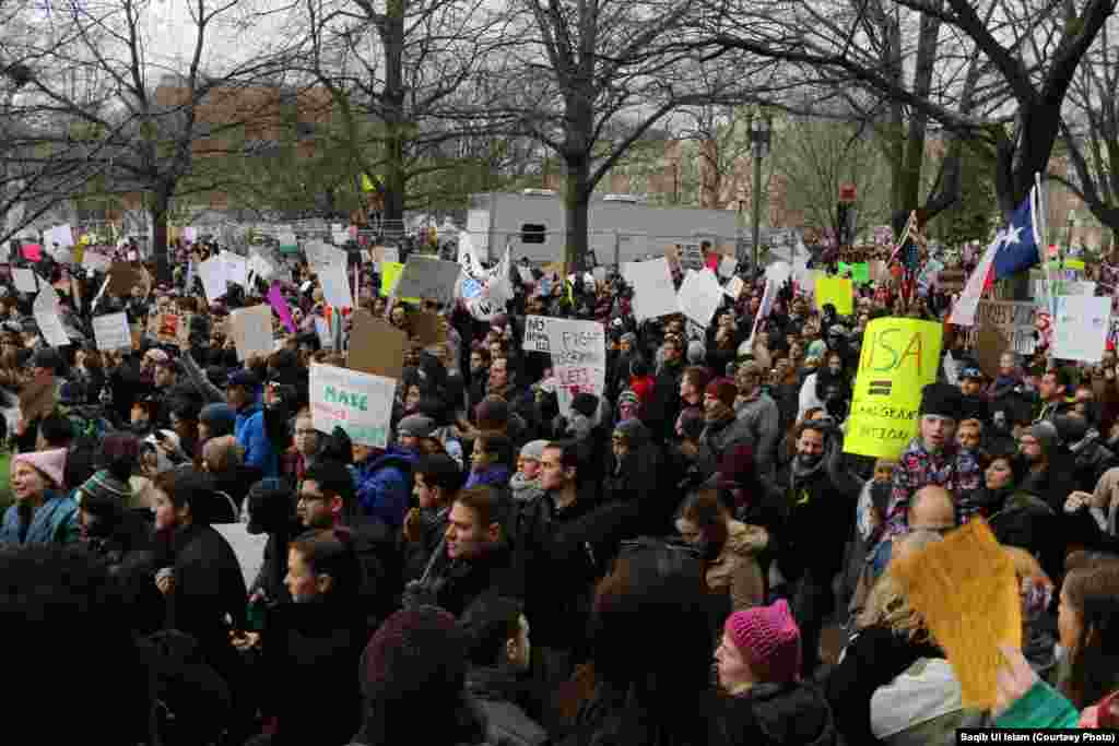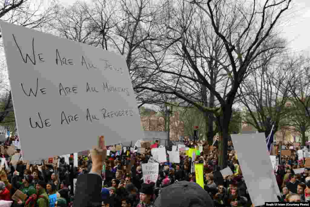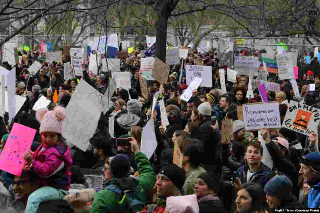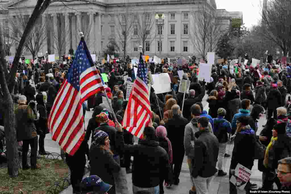 آج دوسرے روز بھی، اتوار کو وائٹ ہائوس کے سامنے سینکڑوں مظاہرین نے احتجاجی مظاہرہ کیا۔ مظاہرین جو نعرے لگا رہے تھے، اُن میں: 'نفرت نہیں، خوف نہیں، مہاجرین کو یہاں خوش آمدید کیا جاتا ہے' شامل تھا۔ فوٹوز: ثاقب الاسلام/تنزیل رحمٰن