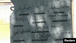 واشنگٹن میں لائے جانے والے دیوار برلن کا یہ حصہ غیر معمولی نہیں کیونکہ اس میں ان لوگوں کے آٹوگراف ہیں جنھوں نے اس تنازعے کے خاتمے میں اہم کردار ادا کیا تھا۔ ان میں سابق امریکی صدر جارج ڈبلیو بش، سابق روسی قائد میخائل گورباچوف، سابق جرمن چانسلر ہلمت کوہل، موجودہ جرمن چانسلر آنگلہ مرخیل، سابق پولیش صدر اور اتحادی قائدین لیچ ویلیسا اور سابق امریکی وزیر خارجہ، جیمس بیکر شامل ہیں۔