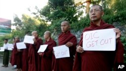 سینکڑوں بودھ، جِن میں درجنوں راہب شامل تھے، رنگون ہوائی اڈے کے باہر احتجاج کیا، اور ’او آئی سی‘ پر ملک کی اقلیتی مسلمان برادری کے حق میں تعصب برتنے کا الزام لگایا۔ احتجاجی مظاہرہ پُرامن رہا۔