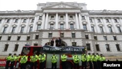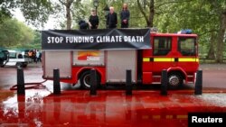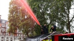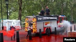 ’ایکسٹینشن ریبیلین‘ نامی تنظیم ماحولیاتی تبدیلیوں سے آگاہی کے لیے کام کرتی ہے۔ جمعرات کو اس تنظیم کے چار کارکنان نے آگ بجھانے والے فائر انجن کا استعمال کرتے ہوئے سڑک اور محکمہ خزانہ کی عمارت پر سرخ رنک کی بارش کر دی۔