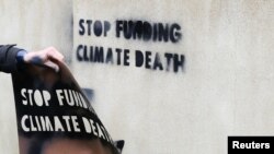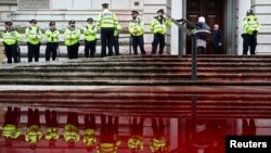 برطانیہ میں ماحولیاتی تبدیلیوں کے خلاف کام کرنے والی تنظیم کے کارکنوں نے محکمہ خزانہ کی عمارت کے سامنے احتجاج کرتے ہوئے سیکڑوں لیٹر ’مصنوعی خون‘ سڑک پر بہا دیا۔