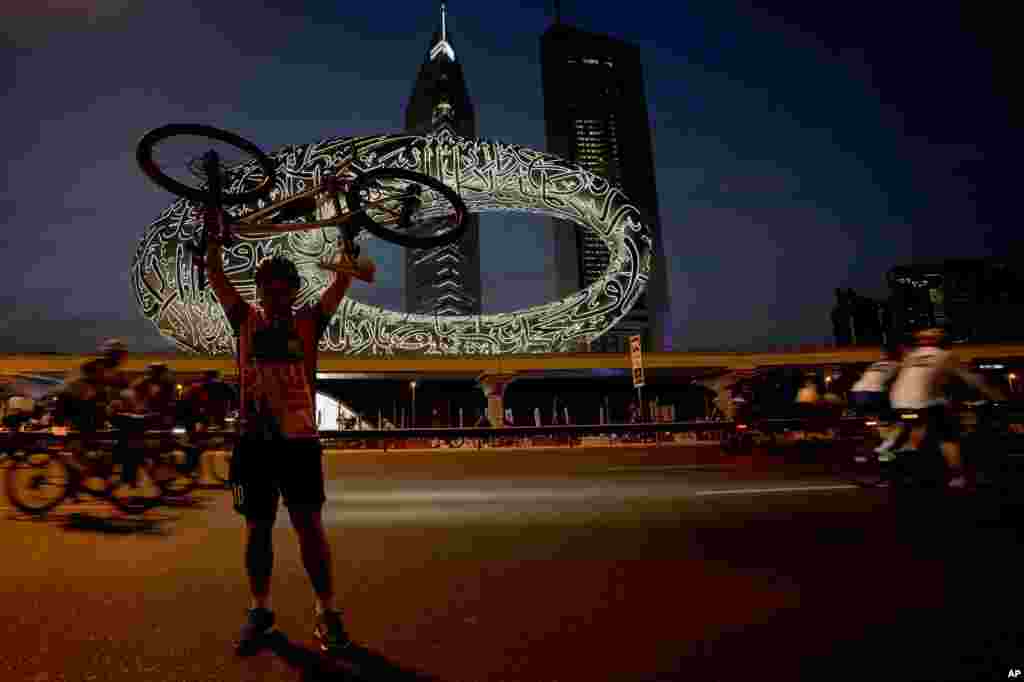 متحدہ عرب امارات (یو اے ای) کے شہر دبئی میں اتوار کی صبح سورج نکلنے سے قبل مرکزی شاہراہ شیخ زید روڈ پر گاڑیاں روک کر ہزاروں سائیکل سواروں کو راستہ دیا گیا۔ ہر سال ہونے والی یہ سائیکل ریس 10 لائنوں والی شاہراہ پر ہوئی، جہاں سے دنیا کی بلند ترین عمارتوں کو دیکھا جا سکتا ہے۔ ان میں برج خلیفہ اور مستقبل کا میوزیم شامل ہیں۔ ریس میں شریک سائیکل سواروں نے سورج نکلنے پر تصویروں کے لیے پوز بنوائے اور ہائی وے پر سائیکلیں دوڑائیں۔