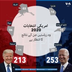 ووٹوں کی اب تک ہونے والی گنتی کے مطابق ریاست ایریزونا اور نیواڈا میں جو بائیڈن بہت معمولی فرق سے صدر ٹرمپ سے آگے ہیں۔ ریاست کے ایریزونا کے 11 جب کہ نیواڈا کے 6 الیکٹورل ووٹ ہیں اور اگر جو بائیڈن ان دو ریاستوں میں اپنی لیڈ برقرار رکھنے میں کامیاب ہوجاتے ہیں تو وہ صدر بننے کے لیے درکار 270 الیکٹورل ووٹ کے ہدف تک پہنچ جائیں گے۔