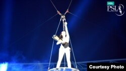 تقریب میں علی ظفر کی آمد فلمی انداز میں ہوئی۔ انہوں نے فضا میں اسکیٹنگ بورڈ اور اپنی پرفارمنس سے اسٹیڈیم کا ماحول گرما دیا ۔ نیلے رنگ کی روشنیوں اور فضا میں اسکیٹنگ بورڈ کے ساتھ پرفارمنس اور میدان میں مختلف فنکاروں کے ڈانس نے وہ سماں باندھا کہ پورا اسٹیڈیم جھوم اٹھا۔