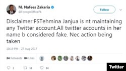 تاہم چند گھنٹوں کے بعد دفترِ خارجہ کے ترجمان نفیس ذکریا نے ٹوئٹر پر اپنے پیغام میں ان ٹوئٹس سے اظہارِ لاتعلقی کرتے ہوئے کہا کہ سیکرٹری خارجہ تہمینہ جنجوعہ کو کوئی ٹوئٹر اکاؤنٹ نہیں ہے لہذا ان کے نام سے موجود اکاؤنٹس کو جعلی سمجھا جائے۔
