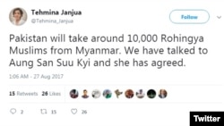 پاکستان کی سیکرٹری خارجہ تہمینہ جنجوعہ کی تصویر اور نام سے ٹوئٹر پر بنے ایک اکاؤنٹ پر اتوار کی شام ایک پیغام سامنے آیا کہ پاکستان، میانمار سے 10 ہزار روہنگیا مسلمانوں کو اپنے ہاں پناہ دے گا اور اس بارے میں (میانمار کی وزیر خارجہ) آنگ سان سوچی سے بات ہوگئی ہے اور وہ اس پر رضامند ہیں۔
