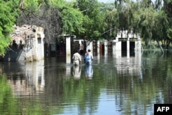 سندھ کے شہر سکھر کے نواحی علاقے سیلاب کی وجہ سے کئی کئی فٹ پانی میں ڈوبے ہوئے ہیں جس کی وجہ سے شہریوں کو شدید مشکلات کا سامنا ہے۔