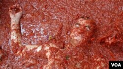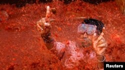 اس سے پہلے کہ آپ کا تخیل آپ کو ڈراؤنی فلموں کی زندہ لاشوں، خون کے تالابوں اور قتل و غارت کے مناظر کی جانب لے جائے آپ کو بتادوں کہ یہ تصویر ایک منچلے کی ہے جو ٹماٹروں کے رس اور گودے میں لوٹنے کے مزے لے رہا ہےاور وہ ان ہزاروں تماشائیوں میں سے ایک ہے جو اسپین کے اس تہوار میں حصہ لینے کے لیے دور دور سے آتے ہیں۔