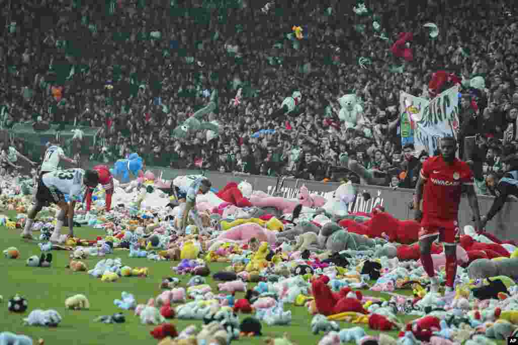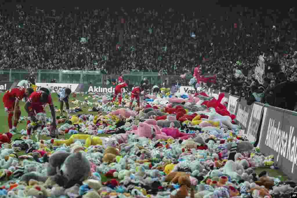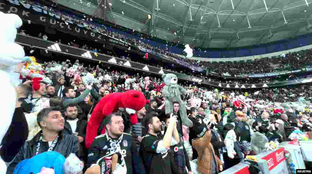 ترکیہ کے شہر استنبول میں فٹ بال میچ کے بعد شائقین نے اسٹیڈیم میں کھلونوں کا ڈھیر لگا دیا۔ ووڈا فون پارک میں اتوار کو فٹ بال شائقین نے زلزلے سے متاثرہ بچوں سے اظہارِ یکجہتی کے لیے بڑی تعداد میں کھلونے عطیہ کیے۔ اس میچ میں چار منٹ 17 سیکنڈ کی خاموشی بھی اختیار کی گئی۔ ترکی میں چھ فروری کو رات چار بج کر 17 منٹ پر تباہ کن زلزلہ آیا تھا جس کے نتیجے میں 44 ہزار سے زائد افراد ہلاک ہوئے تھے۔ کئی ایسے بچے ملبے سے زندہ نکالے گئے جن کے خاندان مر چکے ہیں جب کہ بڑی تعداد میں بچوں کی اموات بھی ہوئی ہیں۔
