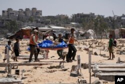 خان یونس کے ایک قبرستان میں کارکن اسرائیل کی جانب سے واپس کی گئی فلسطینیوں کی لاشوں کی تدفین کر رہے ہیں ، فوٹو اے پی 5 اگست 2024