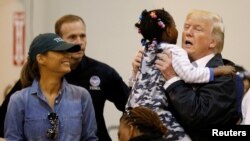 صدر ٹرمپ اور خاتون اول میلانیہ ٹرمپ نے آج ہفتے کے روز ہیوسٹن کے سیلاب زدہ علاقوں کا دورہ کیا جہاں اُنہوں سے شیلٹرز میں پناہ لینے والے متاثرین سے ملاقات کی۔ اُنہوں نے وہاں موجود بچوں کے ساتھ تصویریں کھنچوائیں اور لوگوں کی داستانیں سنیں۔ ٹیکساس کے گورنر گریگ ایبٹ بھی اُن کے ہمراہ تھے۔