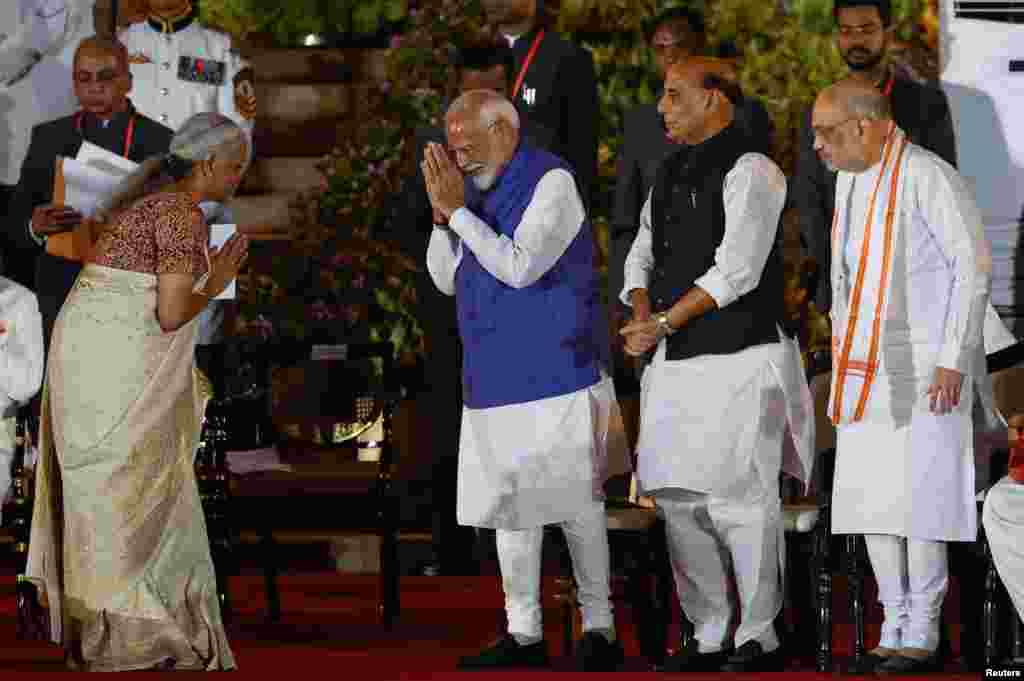 نریندر مودی تیسری بار بھارت کے وزیرِ اعظم بن گئے ہیں۔ اتوار کو صدر دروپدی مورمو نے ایوان صدر راشٹرپتی بھون میں نریندر مودی سمیت ان کی 72 رکنی کابینہ سے حلف لیا۔ تقریبِ حلف برداری میں سیاسی رہنماؤں، کاروباری شخصیات سمیت بالی وڈ اسٹارز نے بھی شرکت کی۔ مودی اس سے قبل 2014 اور 2019 میں ہونے والے انتخابات میں بی جے پی کی کامیابی کے بعد بھی وزارتِ عظمیٰ کے منصب پر فائز رہ چکے ہیں۔
