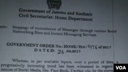 بُدھ کو جموں میں جاری ہونے والے ایک سرکاری بیان میں کہا گیا ہے کہ ’’کچھ عرصے سے یہ بات مشاہدے میں آئی ہے کہ امن و سکون کے دشمن عناصر سماجی ویب سائٹس کا غلط استعمال کر رہے ہیں‘‘۔ ادھر مبصرین کے مطابق، پابندی کو ’’حالیہ اور ماضی میں پیش آنے والے واقعات کے پس منظر میں بھی دیکھا جانا چاہیئے‘‘