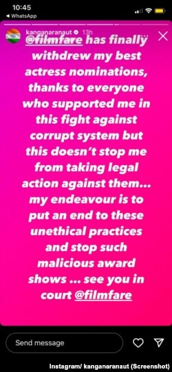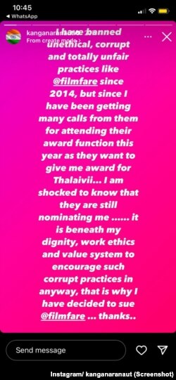 کنگنا رناوت نے اتوار کو اپنے انسٹاگرام اکاؤنٹ پر اسٹوریز شیئر کیں جس میں انہوں نے بتایا کہ وہ غیر اخلاقی، کرپٹ اور غیر منصفانہ نظام کی وجہ سے سن 2014 سے فلم فیئر ایوارڈز میں شرکت نہیں کر رہیں۔