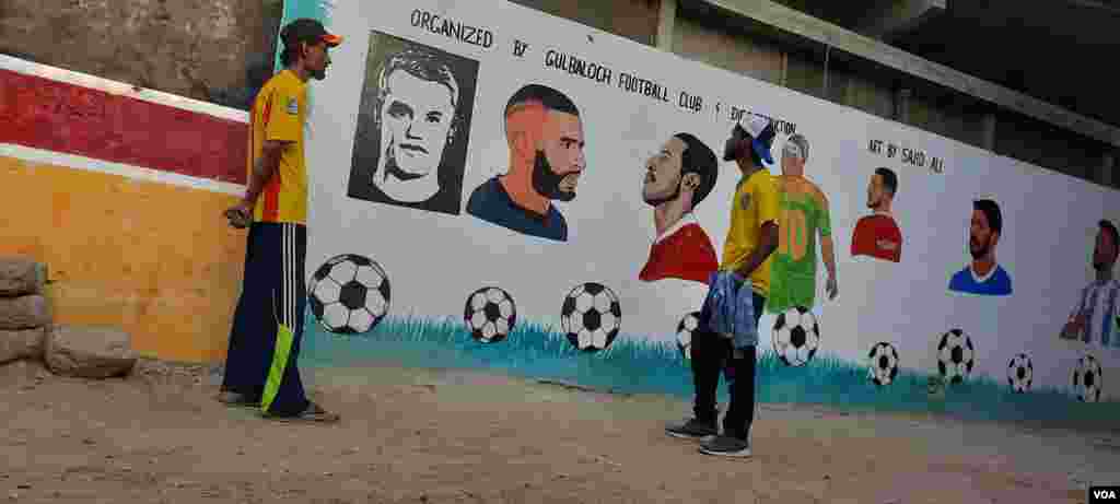 قطر میں فٹ بال ورلڈ کپ کا آغاز اتوار کو ہو رہا ہے۔ دنیا کے دیگر ممالک کی طرح پاکستان میں بھی اس کھیل کے جنون اور عشق میں مبتلا لوگوں کی کمی نہیں۔ کراچی کے وہ علاقے جہاں فٹ بال کھیلنے اور دیکھنے والوں کی بڑی تعداد موجود ہے وہاں اس کھیل سے محبت میں گلیاں اور محلے پسندیدہ ٹیموں اور ان کے کھلاڑیوں کی تصاویر سے سجا دی گئی ہیں ۔ ملیر کے ایک مقامی آرٹسٹ نے ورلڈ کپ شروع ہونے سے قبل ہی علاقے کو لوگوں کی پسند کے مطابق رنگوں سے بھر دیا ہے۔ کئی لوگوں نے اپنی پسندیدہ ٹیموں کے پرچم بھی گھروں پر لگائے ہوئے ہیں۔