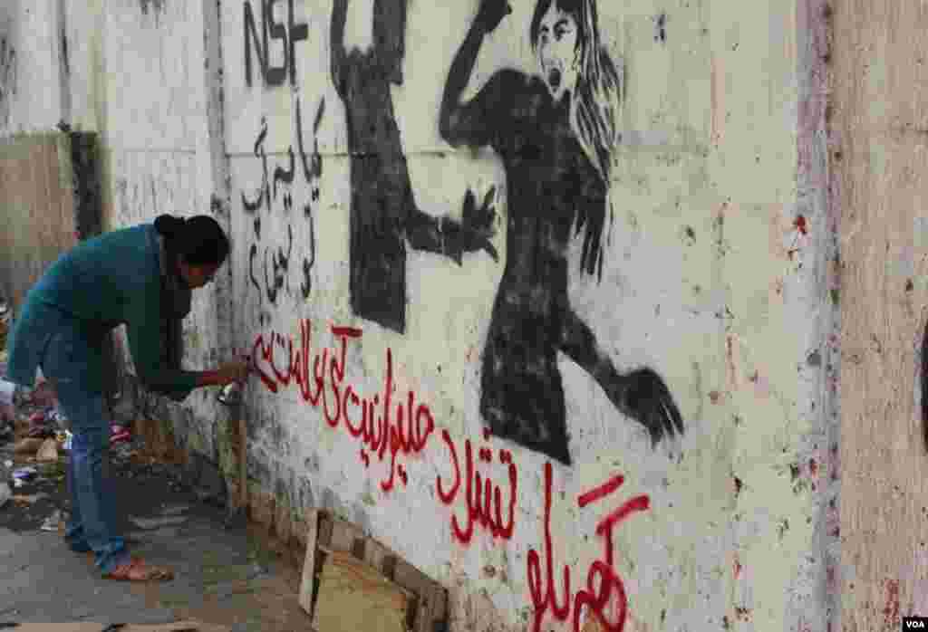 کراچی کی ایک طلبہ تنظیم نیشنل اسٹوڈنٹس فیڈریشن نے شہر بھر کی دیواروں کو خواتین کے حق میں بولنے پر مجبور کردیا ہے. نوجوانوں کا کہنا ہے کہ وہ عوام تک یہ پیغام پہنچانا چاہتے ہیں کہ خواتین کو ان کا حق دیاجائے۔