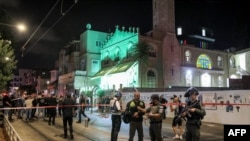 صحافی یکم اکتوبر 2024 کو تل ابیب کے جنوب میں جافا میں یروشلم بلیوارڈ کے ساتھ النزہ مسجد کے باہر فائرنگ کے حملے کے مقام پر اسرائیلی پولیس اور سرحدی محافظوں کے ساتھ جمع ہیں۔