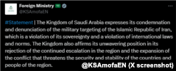 ہفتے کو سعودی وزارتِ خارجہ کے ایک بیان میں کہا گیا ہےکہ ایران کے عسکری اہداف کو نشانہ بنانا اس کی خود مختاری اور بین الاقوامی قوانین اور اصولوں کی خلاف ورزی ہے۔
