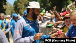 ’ايمريٹس ائيرلائن‘ کي پرواز ای کے624 علامہ اقبال انٹرنيشنل ائيرپورٹ لاہور اتري تو مصباح کو کرکٹ کے ديوانوں اور پاکستان کرکٹ بورڈ کے حکام نے خوش آمديد کہا۔ پرستار انہيں پھول پہناتے رہے تو پی سی بی کے ڈائريکٹر کرکٹ ہارون الرشيد مسلسل ان کا حوصلہ بڑھاتے رہے۔