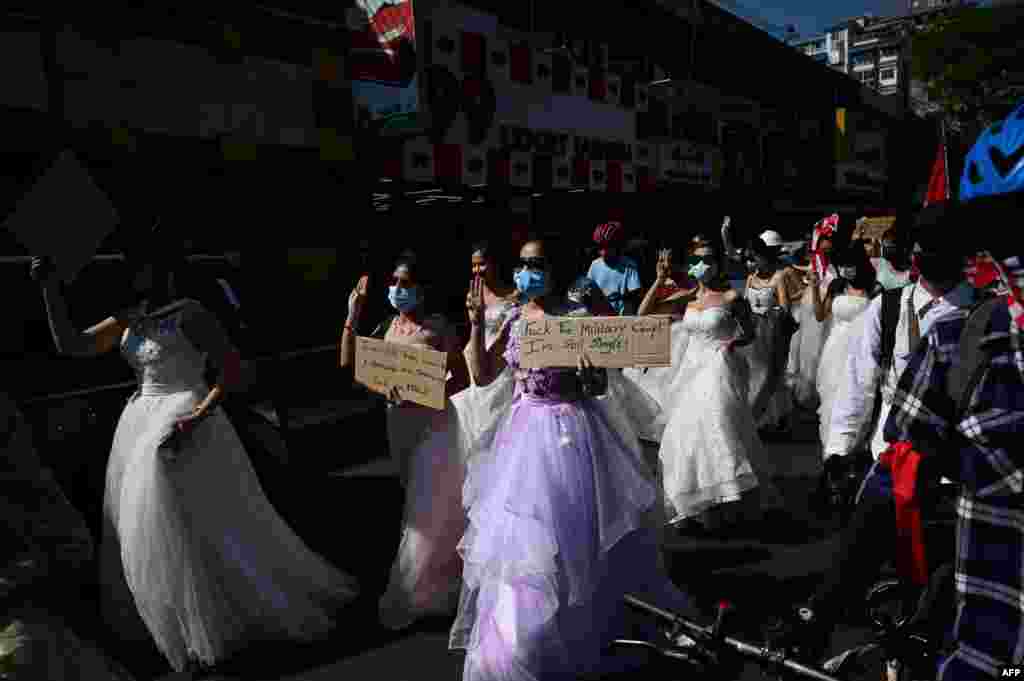 میانمار: کوئی دلہن بن کر سڑکوں پر، کوئی پوسٹرز لیے خیمہ زن