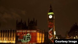 دریں اثناء تنظیم کی جانب سے نریندر مودی کے دورے کے خلاف احتجاج کا ایک منفرد طریقہ بھی اپنایا گیا اور نو نومبر کو برطانوی پارلیمنٹ کی عمارت پر مودی کی تصویر کے ساتھ بڑے بڑے لفظوں میں 'مودی کا خیر مقدم نہیں کرتے' کے الفاظ لکھ دیے گئے۔