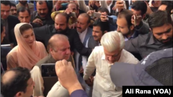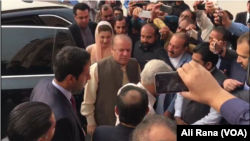 سابق وزیراعظم کے ہمراہ ان کی صاحبزادی مریم نواز اور داماد کیپٹن (ر) صفدر بھی احتساب عدالت میں پیش ہوئے جو پاناما پیپرز کیس میں سپریم کورٹ کے فیصلے کی روشنی میں نیب کی جانب سے شریف خاندان کے خلاف غیر قانونی اثاثے بنانے کے الزام میں دائر ریفرنسز کی سماعت کر رہی ہے۔