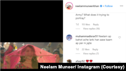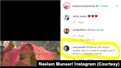 مریم نامی انسٹاگرام صارف نے نیلم منیر کی پوسٹ پر جواب دیتے ہوئے کہا کہ اس آئٹم سانگ کی جو کوئی بھی وجہ ہو لیکن یہ تسلیم کرنا مشکل ہے کہ یہ گانا پاکستانی فلم میں ہے۔