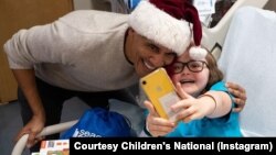 سانتا کا ہیٹ پہنے اور تحفے تحائف اٹھائے، اوباما ’چلڈرینز نیشنل ہاسپیٹل‘ کے چھوٹے بچوں کے وارڈ پہنچے جہاں اُنھوں نے بچوں کو تحفے دیے اور اُنھیں گلے لگایا۔