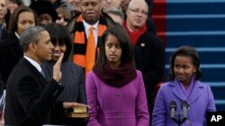 حلف برداری کے موقع پر خاتونِ اول مشیل اوباما اور ان کی صاحبزادیاں مالیا اور ساشا بھی صدر کے ساتھ کھڑی تھیں۔