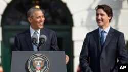 امریکی اور کینیڈا کے پرچموں کی قطاروں کے بیچ کھڑے صدر براک اوباما نے جمعرات کو وائٹ ہائوس میں کینیڈا کے وزیر اعظم جسٹن ٹروڈو کا خیرمقدم کیا، جو کینیڈا کے کسی سربراہ کی جانب سے تقریباً دو عشرے بعد کیا جانے والا سرکاری دورہ ہے۔