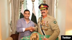 معروف پاکستانی نژاد برطانوی باکسر عامر خان نے پاکستان کے آرمی چیف کی خدمات کے اعتراف میں انھیں باکسنگ کونسل کی چیمپئین شپ بیلٹ پیش کی ہے۔
