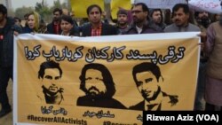 ان سماجی کارکنوں کی بازیابی کے لیے سول سوسائٹی کے نمائندے سراپا احتجاج ہیں اور پیر کو بھی اسلام آباد میں ’نیشنل پریس کلب‘ کے باہر انسانی حقوق کے لیے آواز بلند کرنے والے درجنوں کارکن جمع ہوئے۔