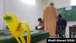 کراچی کے علاقے پی آئی بی کالونی کے ایک پولنگ اسٹیشن میں ایک خاتون اور ایک بزرگ شہری اپنا حقِ رائے دہی استعمال کر رہے ہیں۔