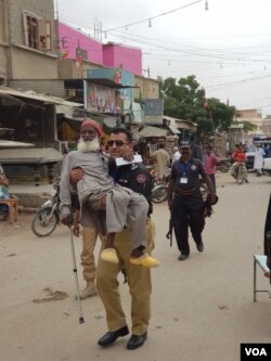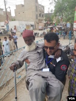کراچی کے علاقے اورنگی ٹاؤن میں پاکستان بازار کے نزدیک ایک پولیس اہلکار ایک معمر شہری کو ووٹ ڈلوانے کے لیے گود میں پولنگ اسٹیشن لے جارہا ہے۔