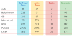خیال رہے کہ پاکستان میں سب سے زیادہ کیسز پنجاب میں سامنے آئے ہیں جہاں حکام نے 2425 افراد میں وائرس کی تصدیق کی ہے جب کہ سندھ میں 1318 افراد میں وائرس کی تصدیق ہوئی ہے۔
