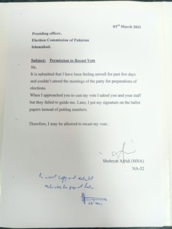 وفاقی وزیر شہریار خان آفریدی نے بیلٹ پیپر پر دستخط کرنے کے بعد پریزائیڈنگ افسر کو نیا بیلٹ پیپر جاری کرنے کی درخواست دے دی۔
