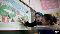 متاثر کن استانی حبہ غزہ کی پٹی کے علاقے میں واقع ایک اسکول میں ڈاون سنڈروم سے دوچار بچوں کی بحالی اور انھیں تعلیم دینے میں مدد کر رہی ہیں۔