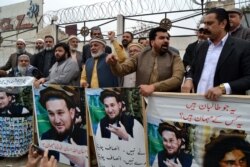 مظاہرے میں شریک افراد نے قاری احسان اللہ احسان کی تصاویر اٹھا رکھی تھیں جن پر مختلف عبارتیں لکھی ہوئی تھیں۔