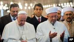 ہفتے ہی کے روز، پوپ نے سولہویں عیسوی صدی میں تعمیر ہونے والی سلطان احمد مسجد کا دورہ کیا، جسے ’نیلی مسجد‘ کہا جاتا ہے۔ وہ استنبول کے مفتی رحیم یاران کے ساتھ کھڑے ہوئے، جہاں پوپ فرینسس نے اپنے ہاتھ بندھے رکھے اور سر نَم کیا، ایسے میں جب مفتی دعائیہ کلمات ادا کر رہے تھے۔