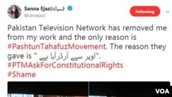 پاکستان میں پشتونوں کے حقوق کے لیے سرگرم 'پشتون تحفظ موومنٹ' کی ایک سرگرم خاتون رکن کو سرکاری ٹی وی چینل 'پاکستان ٹیلی ویژن' کی انتظامیہ نے مبینہ طور پر "اوپر سے آنے والے آرڈر" کی بنیاد پر کام کرنے سے روک دیا ہے۔