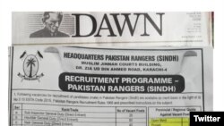 ڈان اخبار کے 26 اگست کے شمارے میں سندھ رینجرز کی جانب سے نئی ملازمتوں کے اعلان کے لئے دئے گئے ایک اشتہار میں نان کامبیٹنٹ کیٹیگری میں جہاں درزی، نائی، بڑھئی، پینٹر، موچی اور ماشکی کی ملازمتوں کا اعلان ہے وہاں ان کے ساتھ سینیٹری ورکر کی ملازمت کے ساتھ صرف غیر مسلم کی شرط آویزاں ہے۔
