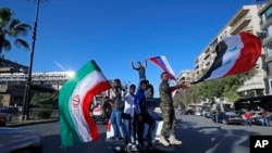 ہجوم میں بہت سے لوگوں شام کے علاوہ روس اور ایران کے پرچم بھی اٹھا رکھے تھے اور وہ تالیاں بجاتے رقصاں نظر آئے۔