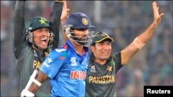 پاکستانی بالرز تمام کوششوں کے باوجودبھارت کی نصف سنچری بننے تک ایک بھی وکٹ نہیں لے سکے۔ لیکن بھارت جیسے ہی 54رنز کے اسکور پر پہنچا عمر گل نے سعید اجمل کے ہاتھوں دھون کو کیچ کرادیا۔ دھون نے 30 رنز بنائے۔