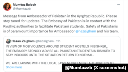 کرغزستان میں پاکستانی طلبہ پر تشدد کے واقعے کے بعد حکومتِ پاکستان نے بھی واقعات کا نوٹس لیتے ہوئے بشکیک میں پاکستانی سفیر کو ہدایت کی ہے کہ وہ فوری طور پر ہاسٹل جا کر طلبہ سے ملیں۔