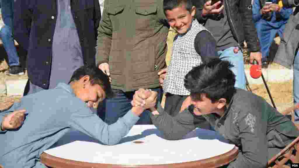 میلے میں شریک بعض شرکا ایک دوسرے کے ساتھ زور آزمائی کرتے بھی دکھائی دیے۔