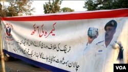 ان کے عقب میں دو بڑے بڑے بینرز لگے ہیں جن پر عوام کو یاد دہانی کرائی گئی ہے کہ ’خبردار ۔۔کیمرے کی آنکھ آپ کو دیکھ رہی ہے۔ اگر آپ نے ٹریفک سگنل توڑا تو ثبوت بھی چالان کے ساتھ آپ کے گھر پہنچادیا جائے گا۔‘